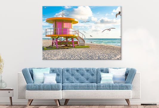 cabin at sunrise on the Miami Beach, Florida, USA with seagulls Wall Art Decor 100% Australian Made