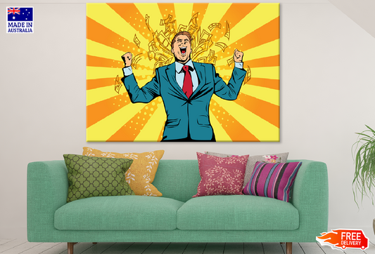 Happy Businessman With Dollar Bills Falling Illustration Print 100% Australian Made