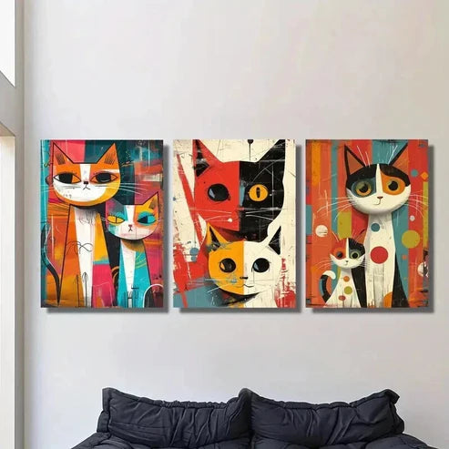 3pcs Vintage Colorful Cat Illustrations Wall Art Canvas Unframed - High Quality Print 100% Australian Made Wall Canvas