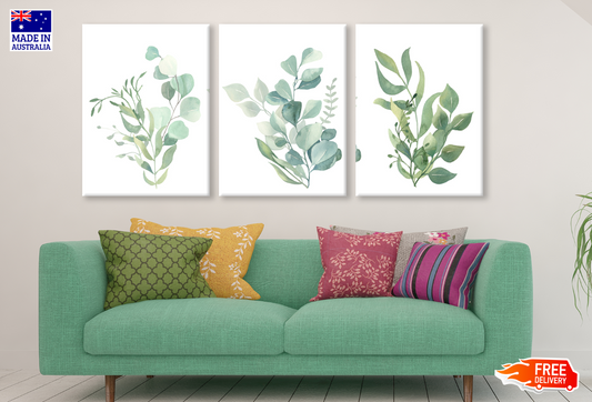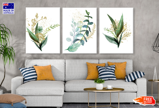 3 Set of Watercolour Floral Green & Gold Leaf Branches High Quality print 100% Australian made wall Canvas ready to hang