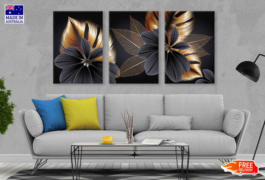 3 Set of Gold Floral Abstract High Quality Print 100% Australian Made Wall Canvas Ready to Hang