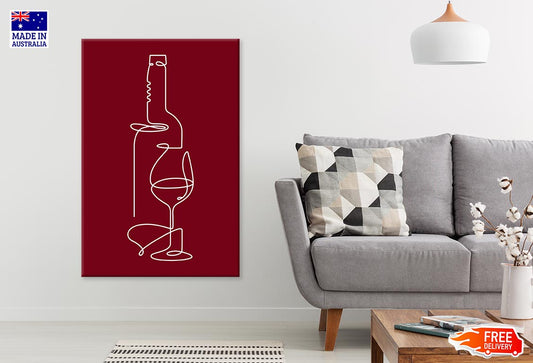 Wine Bottle & Glass Maroon White Line Art Print 100% Australian Made