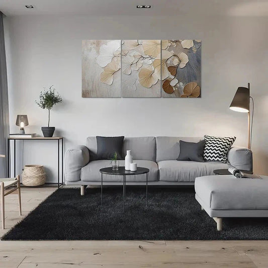 3pcs Abstract Floral Beige Flowers on Gray Metal Print Ready to Hang Art