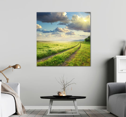 Square Canvas Grass Road Lane & Cloudy Sky View High Quality Print 100% Australian Made