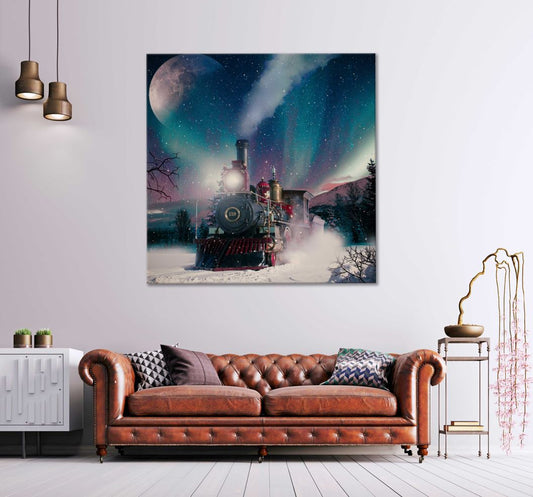 Square Canvas Train in Snow Moon Night View High Quality Print 100% Australian Made