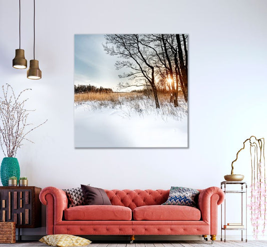 Square Canvas Trees & Grass on Snow Field View High Quality Print 100% Australian Made