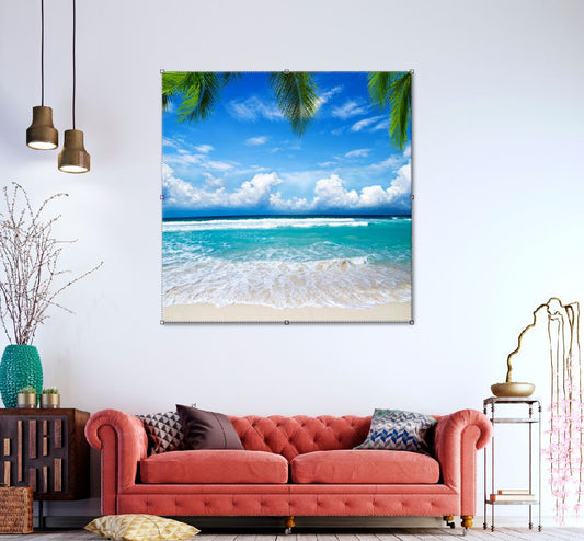 Square Canvas Sandy Beach & Cloudy Blue Sky View Photograph High Quality Print 100% Australian Made