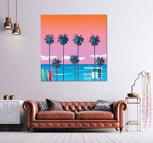 Square Canvas Sunset Sea Palm Trees Vector Art High Quality Print 100% Australian Made