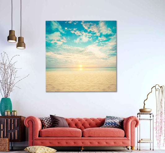 Square Canvas Sandy Beach with Sunrise View Photograph High Quality Print 100% Australian Made