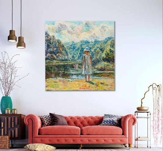Square Canvas Little Girl near Lake Oil Painting High Quality Print 100% Australian Made