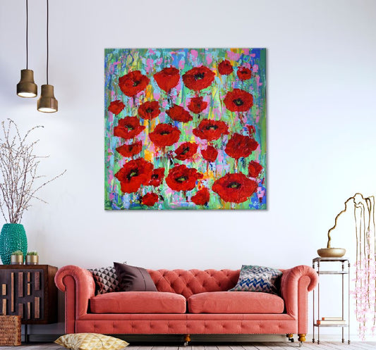 Square Canvas Red Flowers Oil Painting Design High Quality Print 100% Australian Made
