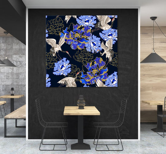 Square Canvas Blue Flowers & Birds Vector Art High Quality Print 100% Australian Made