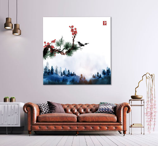 Square Canvas Bird on Red Flower Branch & Mountains Watercolor Painting High Quality Print 100% Australian Made