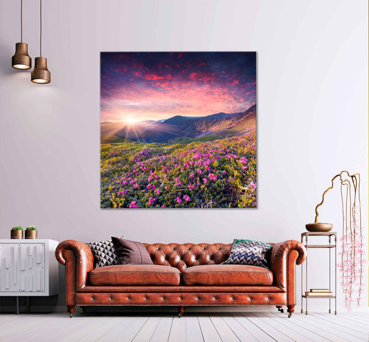 Square Canvas Pink Rhododendron Flowers With Sunrise High Quality Print 100% Australian Made