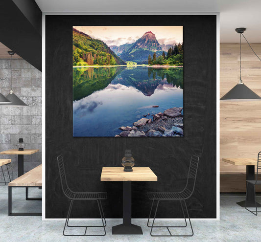 Square Canvas Mountain & Forest Lake View Scenery High Quality Print 100% Australian Made