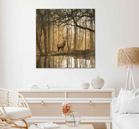 Square Canvas Deer in Misty Forest & Lake VIew Photograph High Quality Print 100% Australian Made