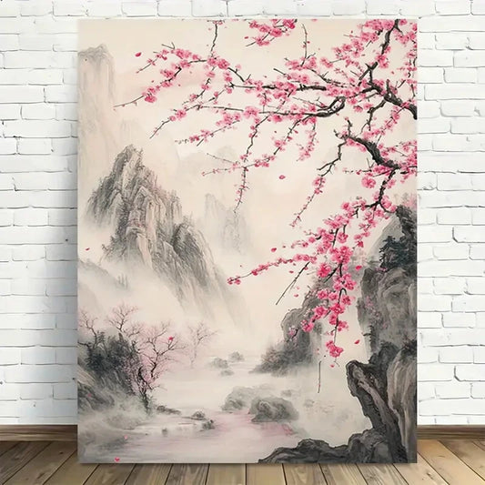 Beautiful Cherry Blossom Serenity Mountain Painting 40x60cm Metal Print Ready to Hang