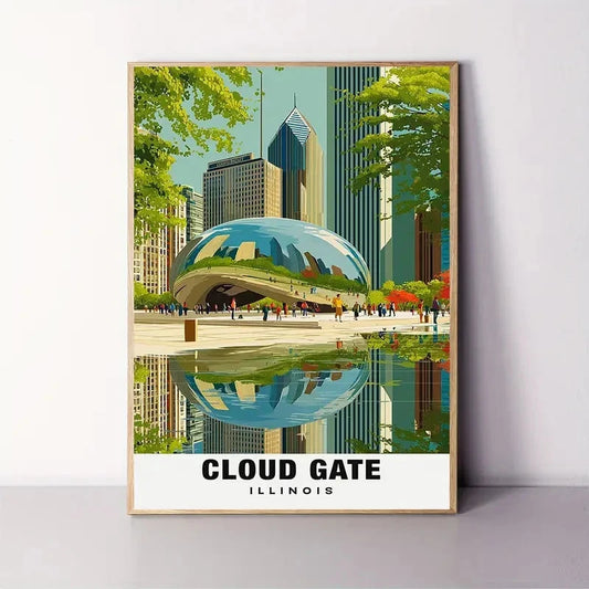 Cloud Gate Illinois Chicago Skyline Lurie Garden Travel Poster Print Wall Art