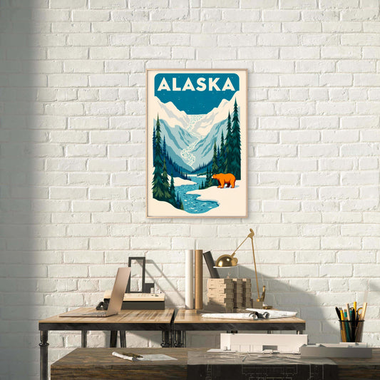 Alaska Wilderness Bear And Mountains Travel Poster Print Wall Art