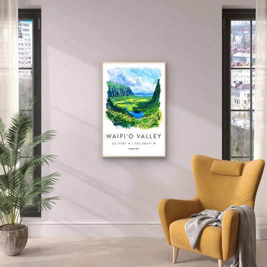 Vintage Waipi'o Valley Hawaii Watercolor Travel Poster Print Wall Art