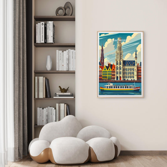 Antwerp Belgium, Budlings & Boats in Sea Vintage Travel Poster Print Wall Art