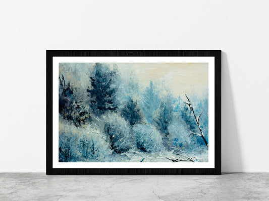 Winter Forest With Winter White Trees, Bushes In The Snow Glass Framed Wall Art, Ready to Hang Quality Print