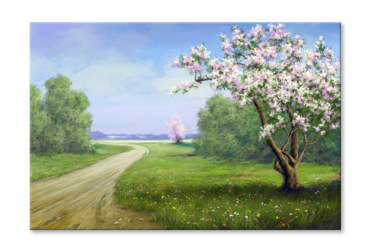 Spring Blossom Tree on Green Grass Field Painting Wall Art Limited Edition High Quality Print