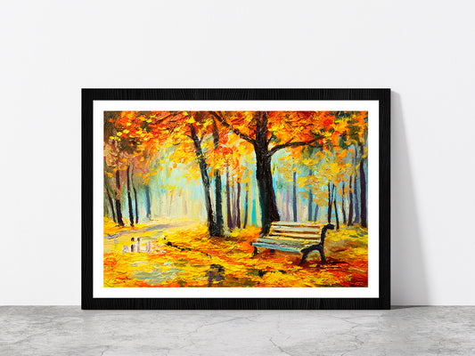 Bench In Autumn Forest Glass Framed Wall Art, Ready to Hang Quality Print