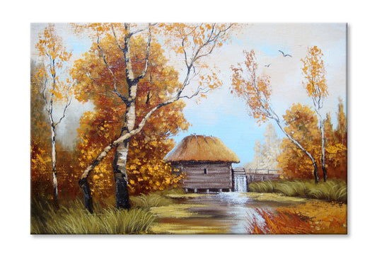 House near Lake & Autumn Trees Oil Painting Wall Art Limited Edition High Quality Print