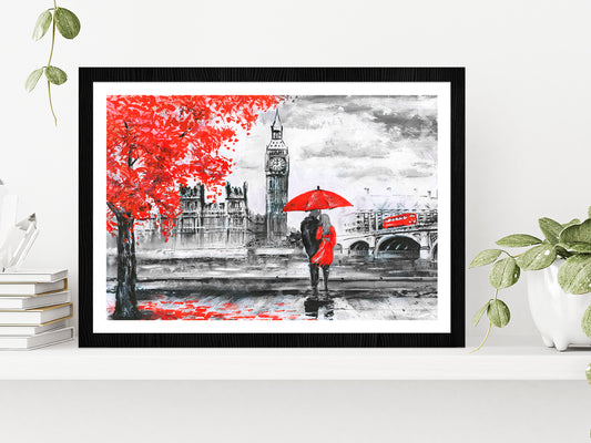 River & Bus On Bridge, Man & Woman Under A Red Umbrella, Street View Of London Glass Framed Wall Art, Ready to Hang Quality Print