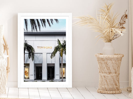 Palm Trees near Fashion Store Photograph Glass Framed Wall Art, Ready to Hang Quality Print