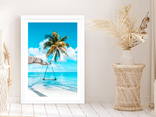 Coconut Tree Beach Swing View Photograph Glass Framed Wall Art, Ready to Hang Quality Print