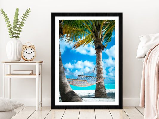 Hammock with Palm Trees Beach Photograph Glass Framed Wall Art, Ready to Hang Quality Print