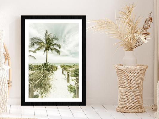 Palm Tree & Sea Path View Photograph Glass Framed Wall Art, Ready to Hang Quality Print