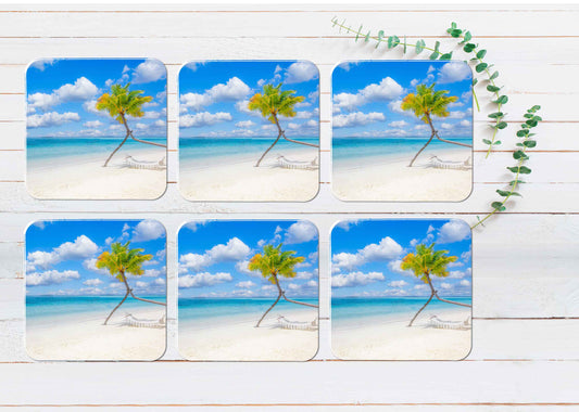 Palm Tree & Hammock near Beach View Coasters Wood & Rubber - Set of 6 Coasters