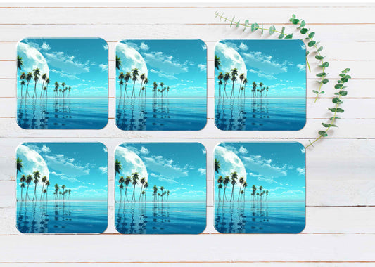 Palms Beach Pool & Moon Blue Sky View Coasters Wood & Rubber - Set of 6 Coasters