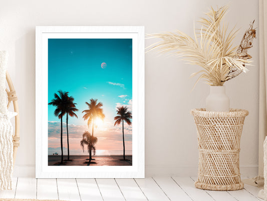 Blue Sky & Sunset Through Palm Trees Photograph Glass Framed Wall Art, Ready to Hang Quality Print