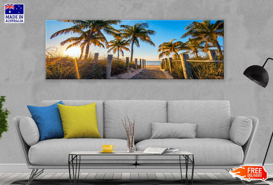 Panoramic Canvas Sea Pathway & Palm Trees Sunset Photograph High Quality 100% Australian Made Wall Canvas Print Ready to Hang