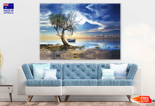 Dead Tree Near Seashore with Boat Photograph Print 100% Australian Made
