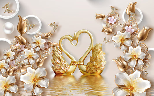 Wallpaper Murals Peel and Stick Removable 3D Gold Peacocks & Flowers Design High Quality