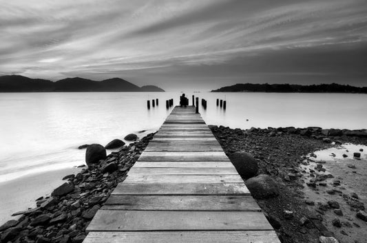 Wallpaper Murals Peel and Stick Removable Wooden Pier Over Beach B&W Photograph High Quality