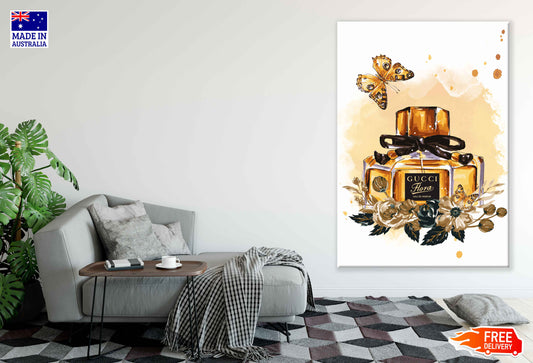 Flora Gold Perfume & Butterflies with Flowers Watercolor Painting Print 100% Australian Made