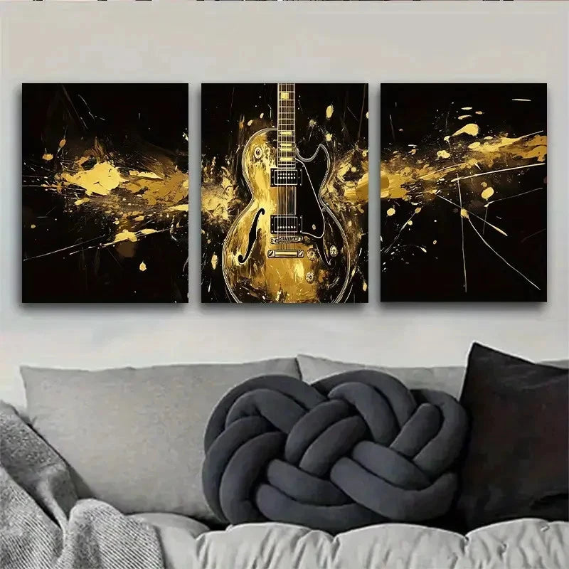 3pcs Abstract Golden Guitar Black & Golden Music Metal Print Ready to Hang Art