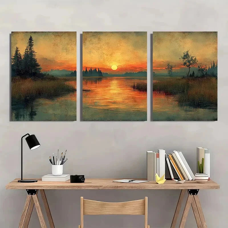 3pcs Antique Hill and Marshland Landscape Art Metal Print Ready to Hang Art
