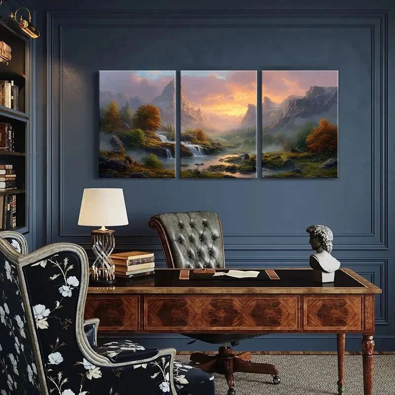 3pcs Autumn Trees Waterfall Sunset Glow Metal Print Ready to Hang Art