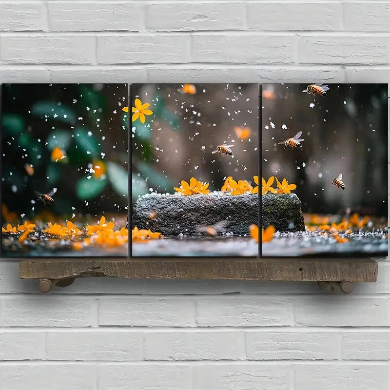 3pcs Bees on Osmanthus Green Leaves Metal Print Ready to Hang Art