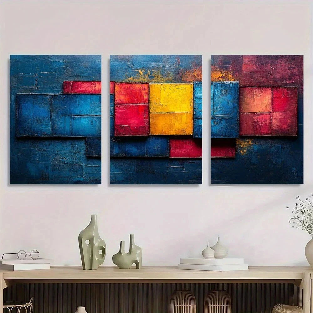 3pcs Blocks And Lines Blue Yellow Red Metal Print Ready to Hang Art