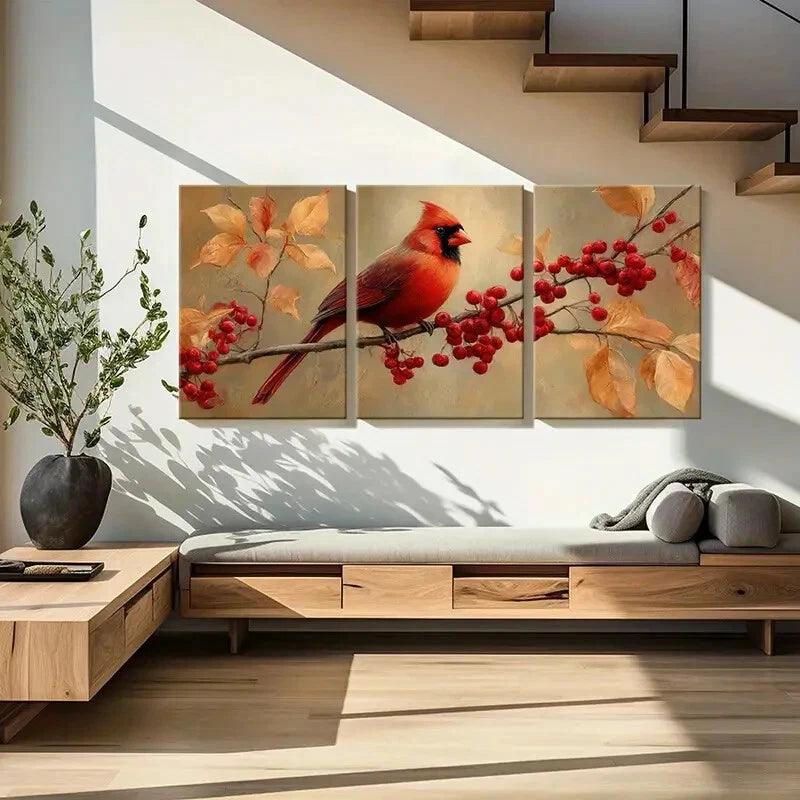 3pcs Cardinal Bird Red Berries Autumn Leaves Metal Print Ready to Hang Art