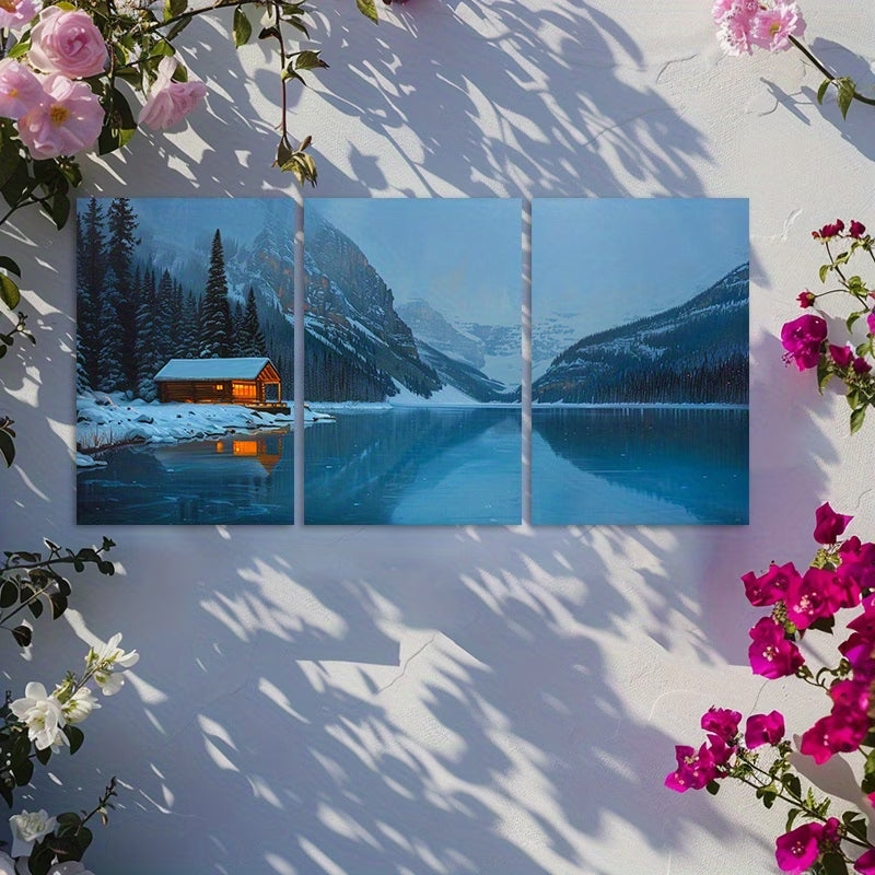 3pcs Charming Lake Moraine Cabin Wall Art Set Canvas Framed 50x70cm - High Quality Print 100% Australian Made Wall Canvas Ready to Hang