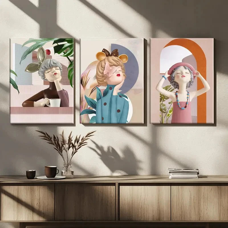 3pcs Charming Porcelain Dolls in Blue & Pink Metal Print Ready to Hang Art